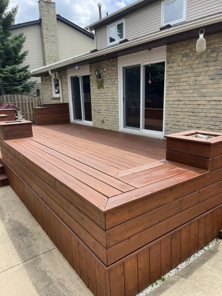 - Longevity: While stain may not last as long as paint, it’s easier to reapply and doesn’t chip or peel like paint can. Stained decks typically need to be re-stained every 2-3 years.